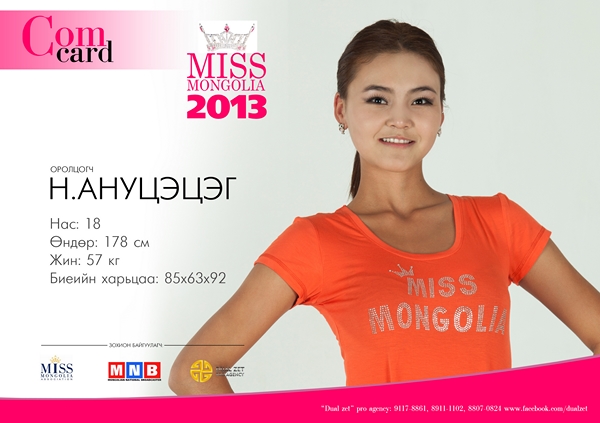 Share Facebook Twitter LinkedIn Pinterest Имэйл "Miss Mongolia-2013" тэмцээний шилдэг оролцогч Н.Ануцэцэг Нас: 18 Өндөр: 178 см Жин: 57 Биеийн харьцаа: 85х63х92