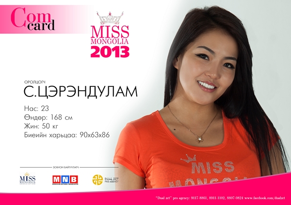 Share Facebook Twitter LinkedIn Pinterest Имэйл "Miss Mongolia-2013" тэмцээний шилдэг оролцогч С.Цэрэндулам Нас: 23 Өндөр: 168 см Жин: 50 Биеийн харьцаа: 90х63х86