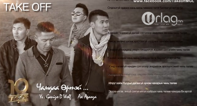 Share Facebook Twitter LinkedIn Pinterest Имэйл Take off хамтлагийнхан арван жилийн ойн төрсөн өдөртөө зориулан шинэ уран бүтээлдээ орсон билээ. Чинзогийн үг, Аранзагийн шүлэг "Чамдаа өртэй" хэмээх шинэ дуугаа гаргажээ. www.URLAG.mn