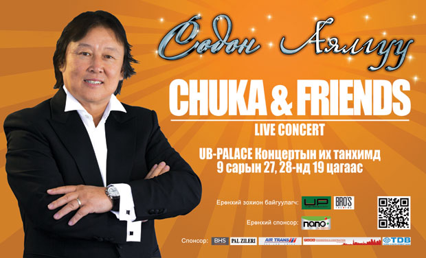 Монголын рок поп урлагийн ууган төлөөлөгчдийн нэг “Харанга хамтлаг”-ийн гитарчин, МУУГЗ Ц. Чулуунбатын Chuka & Friends “Содон аялгуу” амьд тоглолт өнөөдөр, маргааш хоёр тоглогдохоор товоо зарлаад байсан ч дахин нэг өдөр нэмж 27,28,29 нд 19:00 цагаас UB palace-ийн их танхимд тоглогдохоор болжээ.