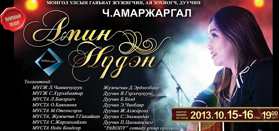 “Үггүй хайр”, “Амин нүдэн” гэх уянгалаг сайхан дуунуудаараа сонсогчдийн сонорыг мялааж яваа уран бүтээлж бол Ч.Амаржаргал. МУГЖ, дуучин Ч.Амаржаргал энэ сарын 15-16-ны өдрүүдэд “Амин нүдэн” тоглолтоо хийх гэж байна.