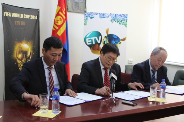 2012 оны 12 р сард FIFA гийн албан ёсны тендэрт оролцож, 2013 оны 4 р сарын 28 ний өдөр тендерт ялсан нь баталгаажиж ETV телевиз монгол улсад 2014 оны 6 р сарын 11 ээс 7 р сарын 12нийг дуустал 20 дахь удаагийн хөл бөмбөгийн дэлхийн аварга шалгаруулах тэмцээнийг шууд дамжуулахаар болсон билээ. ТВ ээр шууд дамжуулах, интернэтээр цацах ,мобайл болон худалдааны радиогийн цацалт зэрэг медиа бүхий л эрхийг дангаар аваад байгаа бол монголын хэвлэл мэдээлийн бусад салбартай хамтран ажиллах гэрээг өнгөрч байгаа 10 р сард хийж дууссан. FIFA world cup 2014 дэлхийн хөл бөмбөгийн аварга шалгаруулах тэмцээн бол олон улсын оюуны өмчөөр баталгаажсан маш том контент учраас ETV телевизийн хувьд монголдоо энэхүү эрхээ батлгаажуулахын тулд Монголын улсын оюуны өмчийн газртай эхнээсээ хамтран ажиллаж байгаа юм аа. Дэлхийн аваргын таних тэмдэг лого зэрэг олон улсын оюуны өмчөөр баталгаажсан зүйлүүдийг ETV эзэмших бөгөөд телевизтэй хамтран ажиллах байгууллагууд энэхүү эрхийг авах бол давхар тэдний эрх ашигийн хамгаалах үүднээс өнөөдрийн санамж бичигт гарын үсэг зурах үйл ажиллагааг харилцан тохиролцож хйилээ. Өнөөдрийн санамж бичигт Монгол улсын оюуны өмчийн газрын дарга Чинбат , шударга өрсөлдөөн хэрэглэгчийн төлөө газрын даргын орлогч Ариунболд , ЕТВ телевизийн ерөнхий захирал энхбат нар гарын үсэг зурлаа.