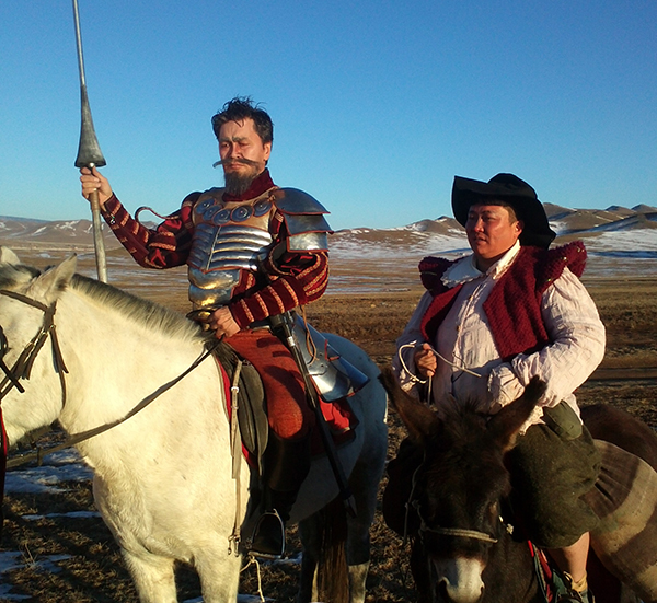 Харин жүжгийн гол дүр Дон Кихотын дүр МУГЖ жүжигчин Б.Жаргалсайхан тоглож байгаа ол Санчо Пансад  СТА Г.Амгаланбаатар нар тоглож байгаа бол Перо Перест СТА Л.Дэмидбаатар, Альдонса Лоренсод Б.Нармандах, Сансон Парраскод жүжигчин Г.Дөлгөөн-Аюуш, Антониод СТА.Д.Ганцэцэг нар тогложээ.