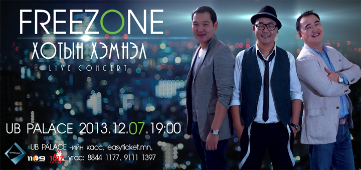 Монголын рок попын түүхэнд 10 гаруй жил уран бүтээлээ туурвиж олон гайхалтай хит дуунуудаараа залуусыг байлдан дагуулсаар ирсэн “FREEZONE” хамтлаг энэ сарын 7-ны өдөр буюу өнөөдөр Улаанбаатар паласын концертын их танхимд 19:00 цагаас ганцхан удаа “ХОТЫН ХЭМНЭЛ” нэртэй амьд тоглолтоо үнэнч шүтэн бишрэгч, фенүүдээ зориулан тоглох гэж байна.
