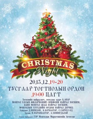 Хоёр өдөр үргэжилж буй “Christmas night” шинэ жилийн хөгжмийн тоглолтонд Монгол Улсын Филармоний Симфони найрал хөгжим, Баян Монгол Жааз найрал хөгжим, Монголын Хүүхдийн Ордны найрал дуучид, дуучин Н.Наранбаатар, А.Хишигдалай нар оролцож та бидний сонсох дуртай “The polar express suite”, “Ирония судьбы или c легким паром”, “Beauty and the Beast”, “Let it snow”, “Carol of the bells”, “Щелкунчик”, “Jingle bells”, “Potter waltz” зэрэг бүтээлүүдийг сонсгох юм.