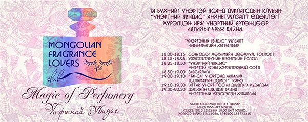 Та бүхнийг “Үнэртэй Усанд Дурлагсдын Клуб”-ын “ҮНЭРТНИЙ УВИДАС” анхны уулзалт өдөрлөгт хүрэлцэн ирж үнэртний ертөнцөөр аялахыг урьж байна. Үнэртэй Усанд Дурлагсдын Клуб нь үнэртэй ус цуглуулагч Н. Орчлонгийн санаачилгаар 2013 онд хоббигоо бусадтайгаа хуваалцах зорилгоор Facebook групп байгуулсан юм. Хүн бүр үнэртэй усыг сонгох таалах мэдрэмж өөр өөр байдаг. Тухайн хүний сонгосон үнэртэй ус түүнийг тодорхойлох сэтгэлийн илэрхийлэл болж өгдөг ажээ. Эрхэм хүндэт үнэртэй дурлагч та үнэртний нууцад нэвтрэхийг хүсвэл өдөрлөгт ирээрэй.
