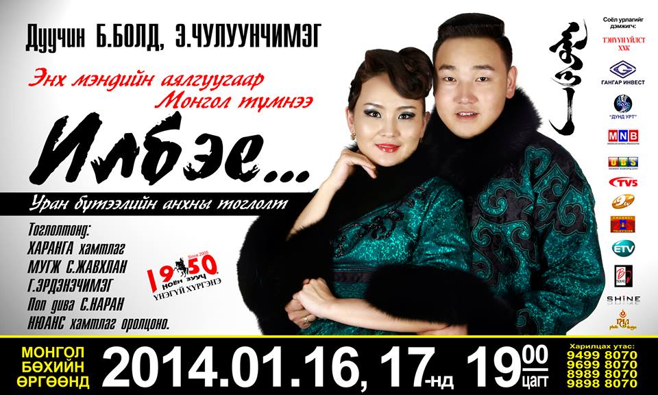 Тэгвэл тэд “Илбэе” нэртэй хамтарсан тоглолтоо энэ сарын 16, 17-нд Монгол бөхийн өргөөнд болох бөгөөд дуучин Б.Болд, Э.Чулуунчимэг нар өөрсдийн хамтран дуулсан хит дуунууд болон олны сэтгэлд хоногшсон шилдэг уран бүтээлүүдийг толилуулах юм байна. Мөн тэд урьд нь гавьяат жүжигчин С.Жавхлан, Т.Баясгалан нарын хамтран дуулсан “Насны хайр”, “Зөвхөн чамдаа”, “Яаж мартах юм бэ” зэрэг цөөнгүй хэдэн дууг сонсогч түмэндээ хүргэхээр төлөвлөжээ. Нийтийн дууны ертөнцөд хүч түрэн гарч ирж буй дуучин хос маань Б.Аялгуу хэмээх хөөрхөн охинтой гэдгийг уншигчид маань санаж байгаа биз ээ.