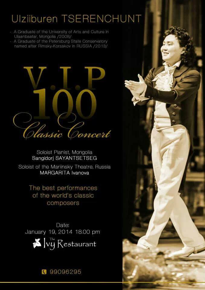 СТА Ө.Цэрэнчунт “VIP 100” тоглолт энэ сарын 19-ны өдөр “IVY” ресторанд тоглогдох гэж байна. Дэлхийн сонгодог хөгжмийн зохиолчдын шилдэг бүтээлүүд энэ үдэш зөвхөн СТА Ө.Цэрэнчунтаар дамжин та бүхэнд хүрэх гэж байна. Мэргэжлийн өндөр түвшинд гайхалтай тоглолтыг амлаж байгаа Ө.Цэрэнчунтын хувьд энэхүү тоглолт нь эх орондоо хийж байгаа тав дахь бие даасан тоглолт юм. Энэ удаагийн “VIP 100” тоглолтод “Маринский” театрын гоцлол дуучин Маргарита Иванова хамтран оролцож байгаа бөгөөд төгөлдөр хуурчаар Испанид олон жил уран бүтээл туурвиж буй Монголын шилдэг төгөлдөр хуурчдын нэг С.Саянцэцэг оролцож байгаа ажээ.