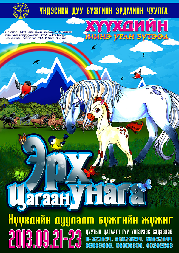 “Эрх цагаан унага” хүүхдийн дуулалт жүжиг нь “Цуутын цагаагч гүү” ардын  үлгэрээс сэдэвлэсэн хүүхдийн хүмүүжилд нөлөөлөх сайхан уран бүтээл болсон билээ.