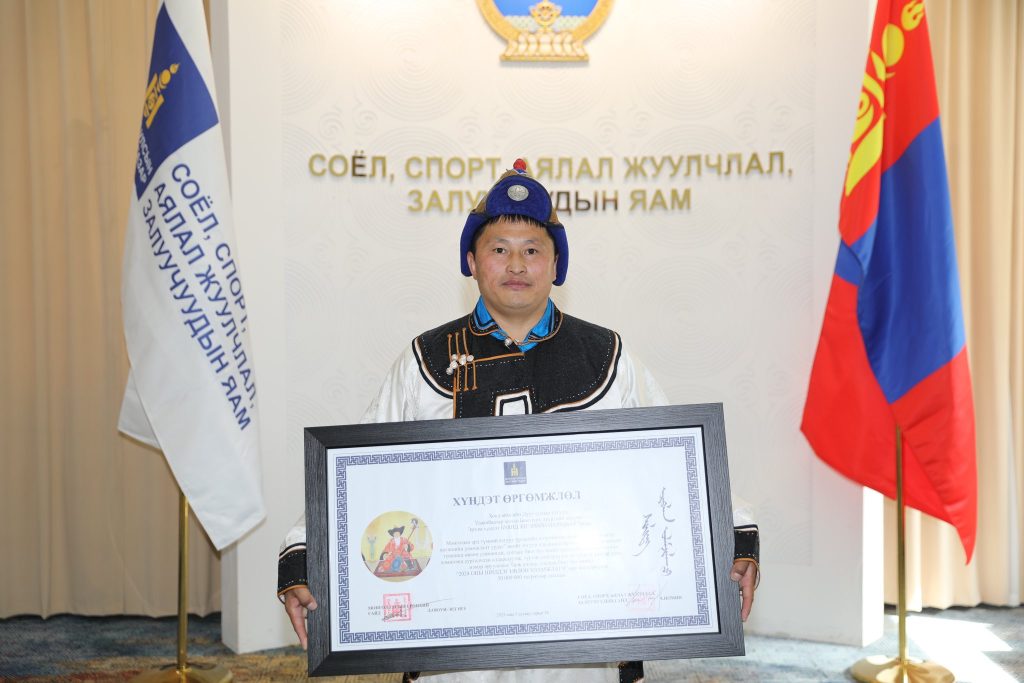 Монгол Улсын Засгийн газрын 2018 оны 354 дүгээр тогтоолоор батлагдсан “Соёлын биет бус өвийг үндэсний болон дэлхийн хэмжээнд сурталчлан алдаршуулах, түгээн дэлгэрүүлэхэд онцгой хувь нэмэр оруулсан өвлөн уламжлагчид мөнгөн шагнал олгох журам”-ын дагуу жил бүр нэг өвлөн уламжлагчийг шалгаруулж, мөнгөн шагналаар шагнадаг уламжлалтай.