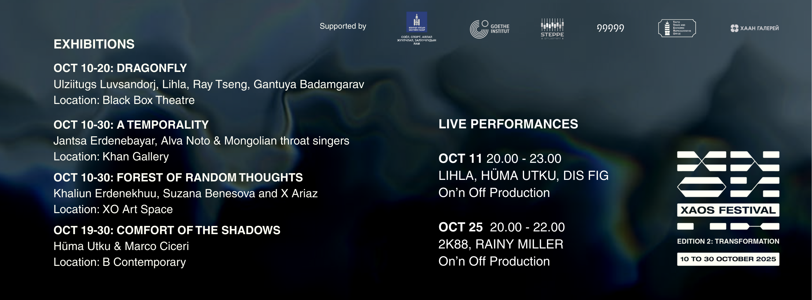 XAOS 2025–ийн амьд тоглолтонд Австрали гаралтай LIHLA, АНУ гаралтай Dis Fig, Турк гаралтай Hüma Utku, Польш уран бүтээлч 2K88, Англи уран бүтээлч Rainy Miller нар, уран бүтээлийн үзэсгэлэнд Итали медиа уран бүтээлч Marco Ciceri, Huma Utku нарын аудиа визуал бүтээл, мөн Монгол уран бүтээлчид Э.Жанцанхорол, Э.Халиун нарын орон зайн баримал, Словак гаралтай Suzana Benesova, Афган гаралтай X Ariaz, Германы Carsten Nicolai / Alva Noto, хөөмэйч Н.Ашид, А.Ундармаа, Д.Дамдин, Д.Даваасүрэн нарын дуу авиан бүтээл оролцох нь улам олон талтай, олон төрлийн уран бүтээлийн өвөрмөц талыг мэдрэх боломжийг нээж байна.