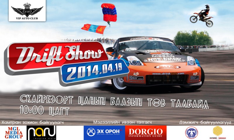 Автомашин сонирхогч залуучуудад аа нэгэн таатай мэдээг дуулгая. Энэ оны хамгийн анхны дрифт шоу зохион байгуулагдаахаар товоо гаргалаа. VIP auto club "Drift" шоуг 3 дахь жилдээ 2014.04.19-ны өдөр "Скай резорт" цанын баазын задгай талбайд зохион байгуулах гэж байна.