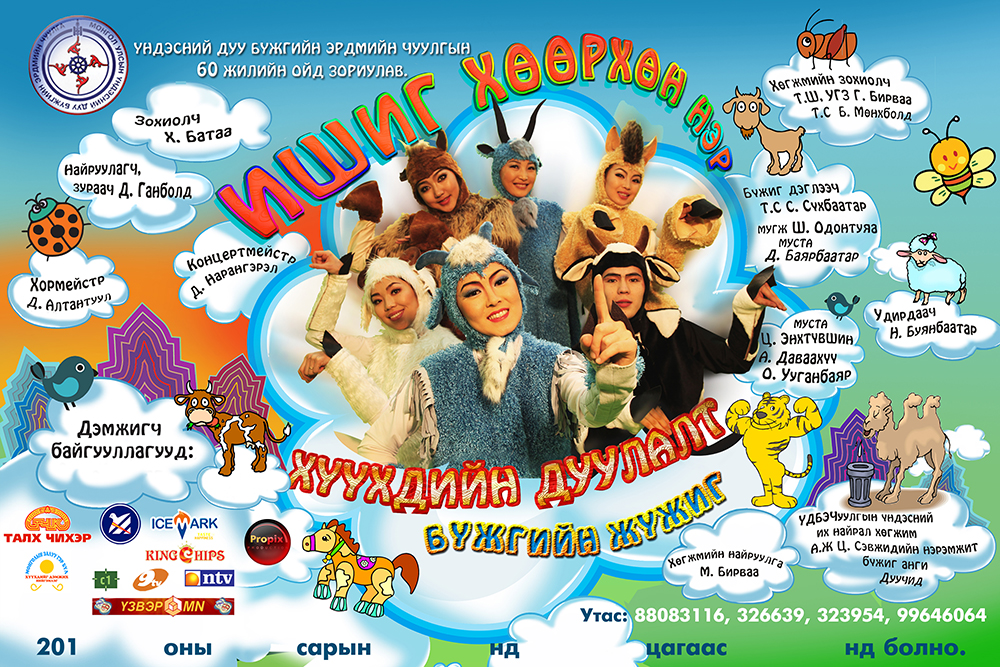 Цуутын цагаагч гүү монгол ардын үлгэрээс сэдэвлэсэн, адал явдалт, сургамжит түүхийг өгүүлсэн “Эрх цагаан унага” хүүхдийн дуулалт жүжгийг 4 сарын 11-15-ны өдрүүдийн 11:00, 13:00-н цагуудаас тоглоно. Зөрүүд, бардам, их зантай Эрх цэнхэр ишигний хөгжилтэй түүх адал явдлыг өгүүлсэн “Ишиг хөөрхөн нэр” хүүхдийн дуулалт жүжгийг 4-р сарын 16-ны 11:00, 13:00-с цагуудаас тоглоно.