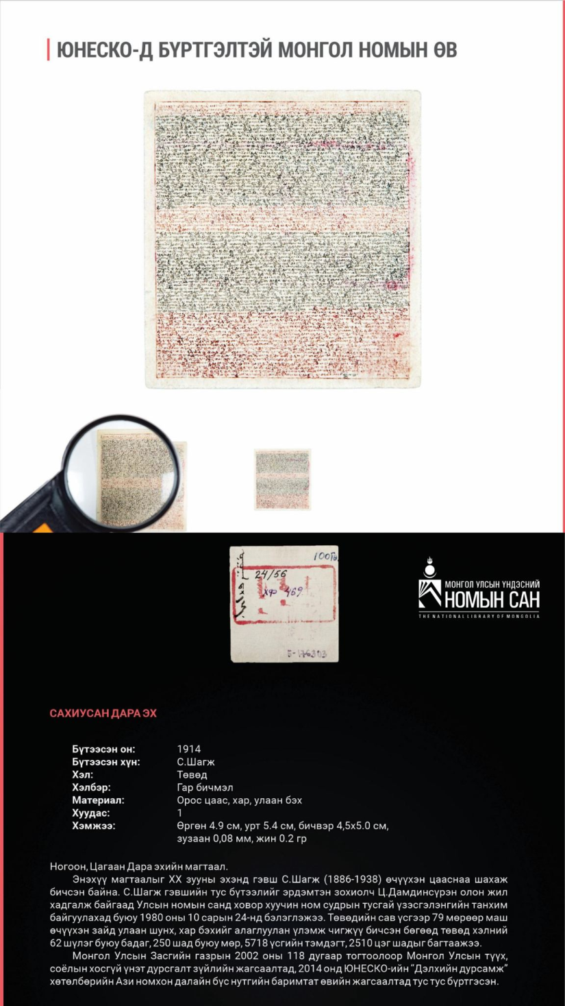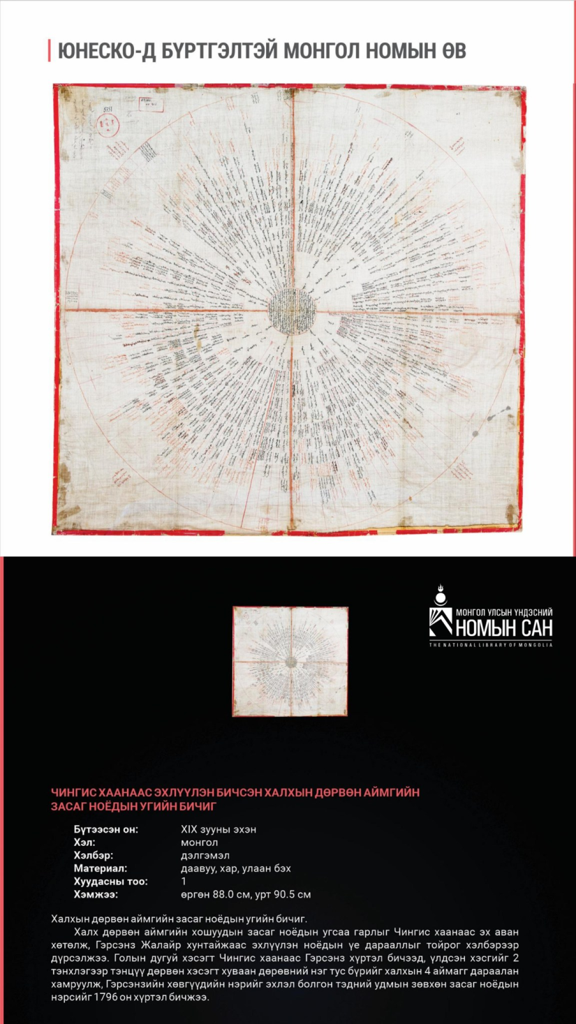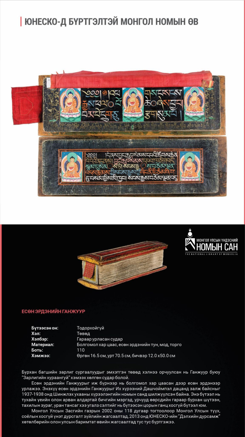 Үүний есийг нь Монгол Улсын Үндэсний номын сангийн сан хөмрөг болон номын сангаас нэр дэвшүүлэн бүртгүүлсэн баримтат өв аж.
