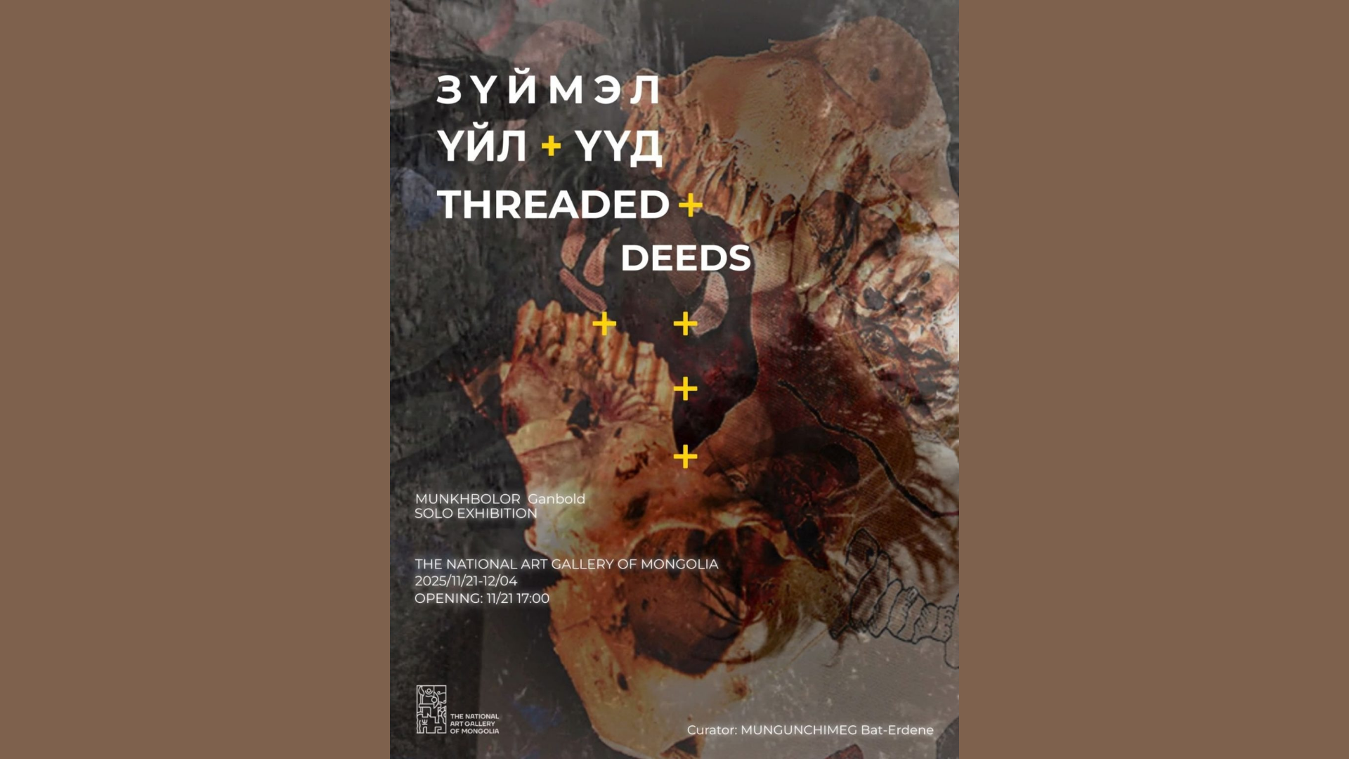 Үзэсгэлэн өнөөдөр буюу арваннэгдүгээр сарын 21-нээс ирэх сарын 4-ний  өдөр хүртэл Монголын уран зургийн галерейн үзэсгэлэнгийн их танхимд 17:00 цагт дэлгэгдэх юм.