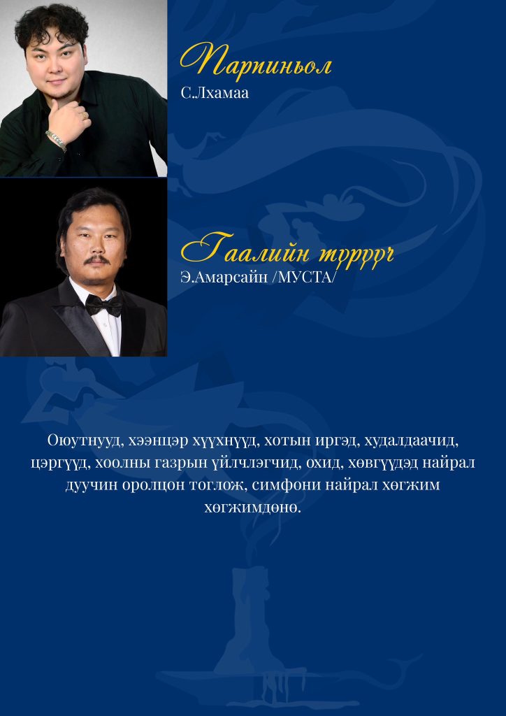 Улсын дуурь бүжгийн эрдмийн театрын тайзнаа энэ сарын 28, 29-ний өдрүүдэд тоглолтод дуурийг удирдаач, Урлагийн гавьяат зүтгэлтэн Н.Туулайхүү болон тус театрын ерөнхий удирдаач Ц.Тэлмүүн-Очир нар удирдахаар болжээ.