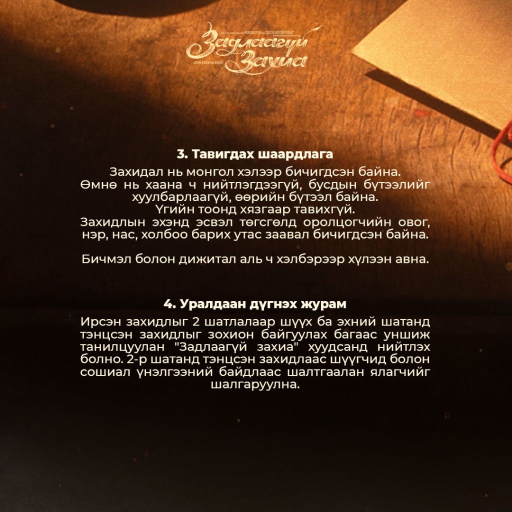 • Захидал нь монгол хэлээр бичигдсэн байна. Өмнө нь хаана ч нийтлэгдээгүй, бусдын бүтээлийг хуулбарлаагүй, өөрийн бүтээл байна. Үгийн тоонд хязгаар тавихгүй.