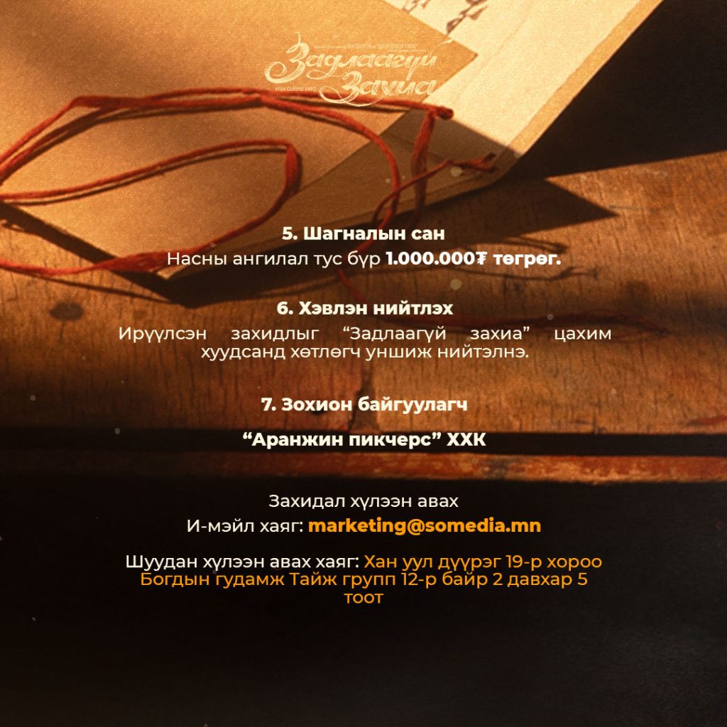 Тус шалгарсан захидалыг “Задлаагүй захиа” цахим хуудасанд нийтэлнэ.