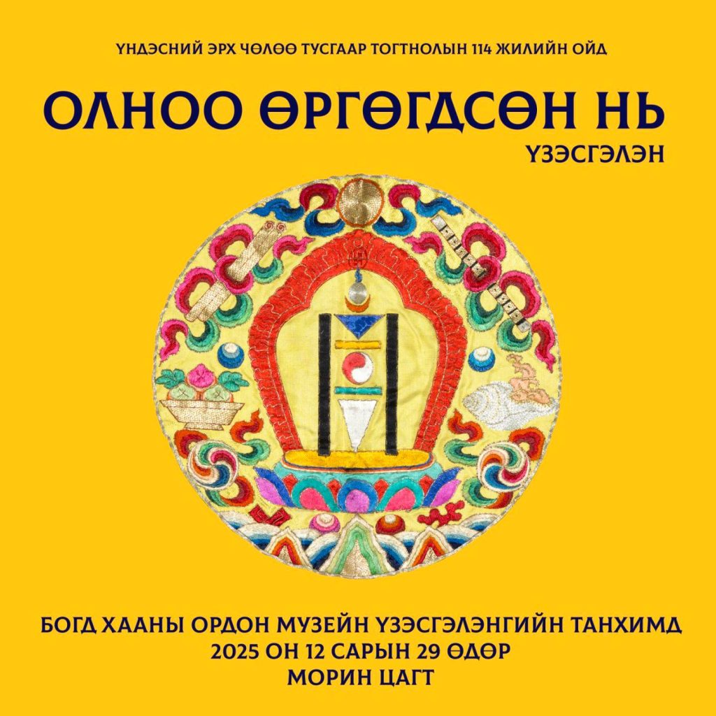 Үндэсний эрх чөлөө тусгаар тогтнолын 114 жилийн ойд зориулсан  “Олноо өргөгдсөн нь” үзэсгэлэнг Богд хааны ордон музейд  энэ сарын 29-нд нээнэ.