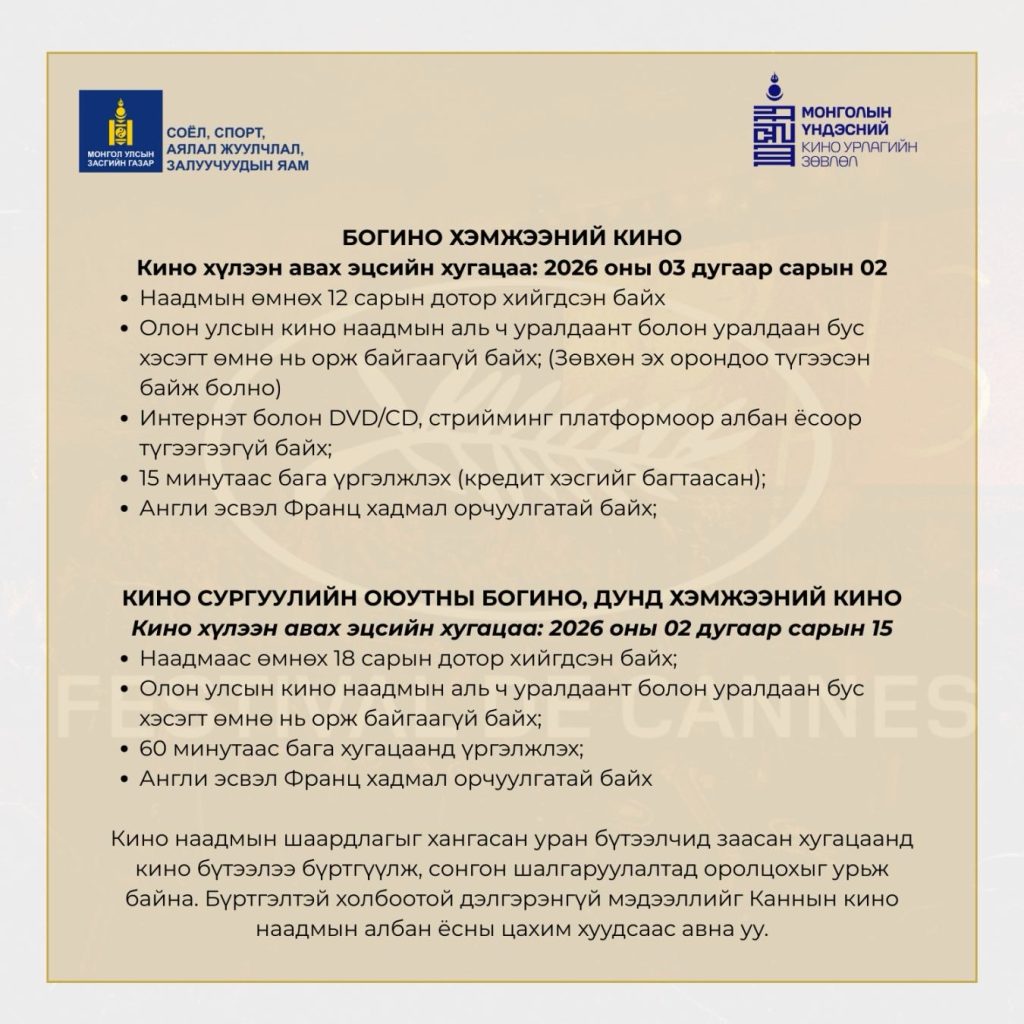 Бүртгэл нь Каннын кино наадмын https://moncompte.festival-cannes.com/…/defaultfestival… хуудсаар дамжин явагдана.