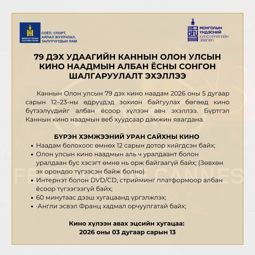 79 дэх удаагийн Каннын олон улсын кино наадам 2026 оны тавдугаар сарын 12-23-нд зохион байгуулах бөгөөд кино бүтээлүүдийг албан ёсоор хүлээн авч эхэллээ.