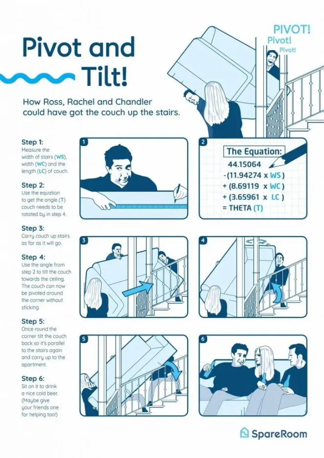 Ялангуяа АНУ-ын Friends цувралд буйданг шат өгсүүлэх гэж зовдог хэсэг хамгийн түгээмэл жишээ юм. Үүнтэй холбогдуулан Scientific American: “Росс Геллерийн ‘Pivot!’ гэж орилсныг тайлбарлахад 119 хуудастай өгүүлэл шаардлагатай болжээ” хэмээн хошигножээ. Доктор Бэк энэ бодлогыг цэргийн алба хааж байх үедээ судалгааны мэргэжилтнээр томилогдохдоо анх “ноцолдож” эхэлсэн гэнэ.