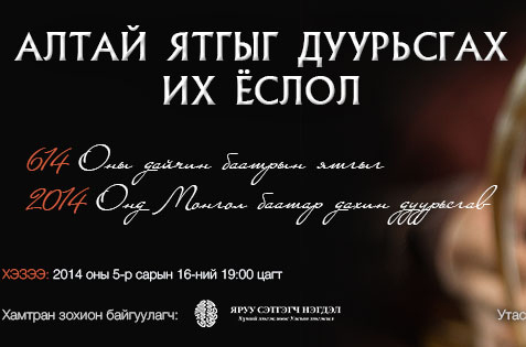 Энэ ажлын эхлэл болгож, Алтай ятгыг монголчуудад танилцуулж эгшиг аялгууг нь сонсгох, дэлхий дахинд зарлах АЛТАЙ ЯТГЫГ ДУУРЬСГАХ ИХ ЁСЛОЛ-ыг “Монгол бахархалын төлөө нэгдэцгээе” уриан дор энэ сарын 16-нд АСА циркт зохион байгуулах юм.