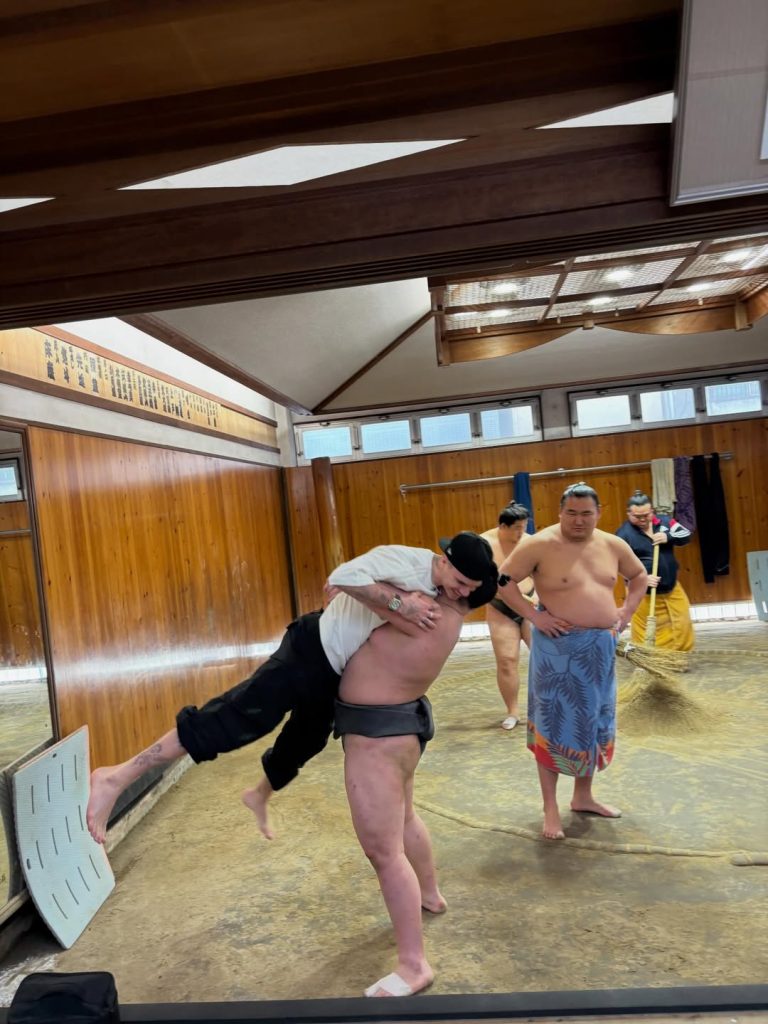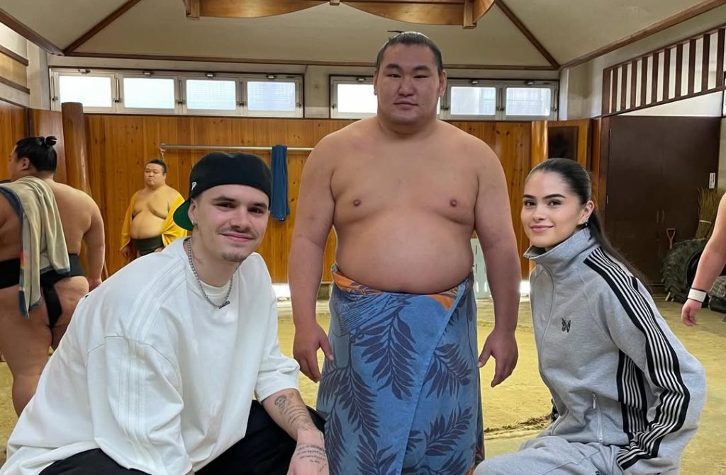 Хөлбөмбөгч Дэвид Бекхэмийн хүү Ромео Бекхэм найз бүсгүйнхээ хамт мэргэжлийн сүмогийн их аварга Хоошорюү С.Бямбасүрэнгийн “Тацүнами” дэвжээнд зочилжээ. Тэрбээр их аварга болон дэвжээний бөхчүүдтэй нь хамт зургаа авахуулж, зарим бөхчүүдтэй барилдаж үзсэн байна.