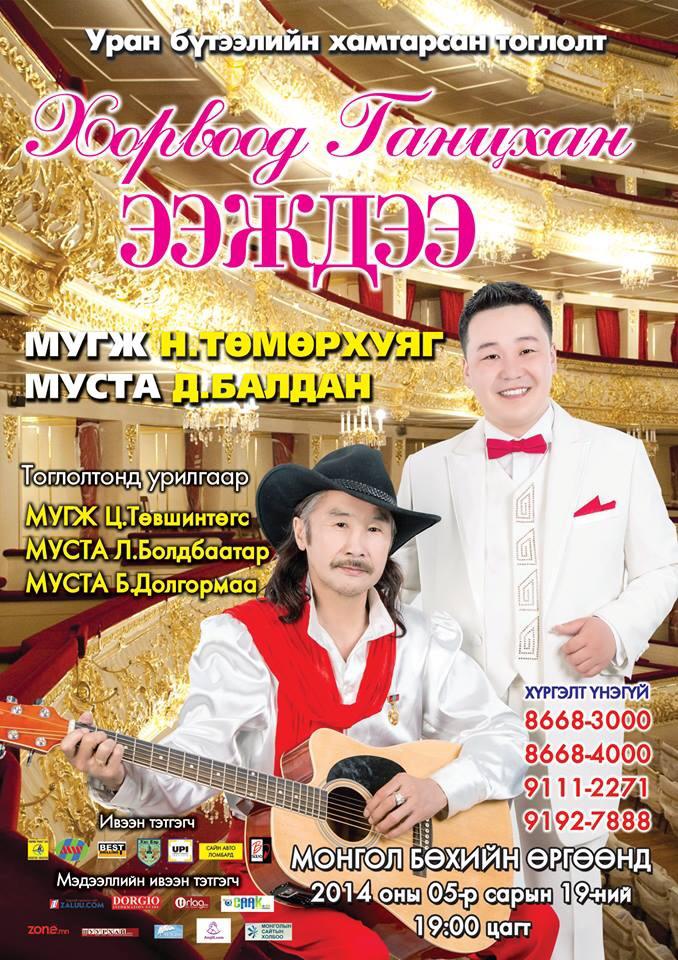Дуунд дуртай дуучин монгол түмэнтэйгээ олон сайхан дуунуудаараа учран золгохоор МУГЖ Н.Төмөрхуяг, МУСТА Д.Балдан нар “Хорвоод ганцхан ээждээ” тоглолтоороо өнөөдөр 19:00 цагаас Монгол бөхийн өргөөнөө учран золгох гэж байна. Тэрбээр 1980-аад оны сүүлч, 1990-ээд оны эхээр эрхэм гавъяат маань “Насны намар”, “Хорвоод ганцхан ээждээ”, “Зүрхний уяа”, “Амьдрал хайр дээр тогтдог” зэрэг олон сайхан дууг амилуулж ард түмний зүрх сэтгэлд хоногшуулж өдгөө хүртэл дуулсаар яваа билээ.