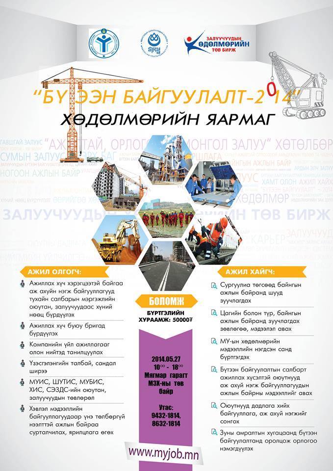 Тэгвэл энэ сарын 27 буюу ирэх мягмар гарагт МЗХ-ны төв байрны залуус танхимд “Бүтээн байгуулалт-2014” хөдөлмөрийн яармагийг зохион байгуулах гэж байна. Ажил олгогчдод ажиллах хүч хэрэгцээтэй байгаа аж ахуйн нэгж байгууллагууд тухайн салбарын мэргэжлийн оюутан, залуучуудаас хүний нөөц болон ажиллах хүч бригад бүрдүүлэх, компанийн үйл ажиллагааг олон нийтэд танилцуулах давуу талууд байгаа бол, ажил хайгчид сургуулиа төгсөөд байнгын ажлын байранд шууд зуучлагдах, цагийн болон түр, байнгын ажлын байранд зуучлагдах зөвлөгөө, мэдээлэл авах, МУ-ын хөдөлмөрийн мэдээллийн нэгдсэн санд бүртгэгдэх, бүтээн байгуулалтын салбарт ажиллах хүсэлтэй оюутнууд аж ахуйн нэгж байгууллагуудын ажлын байрны мэдээллийг авах, оюутнууд дадлага хийх байгууллага аж ахуйн нэгжийг сонгох, зуны амралтын хугацаанд бүтээн байгуулалтанд оролцож орлогоо нэмэгдүүлэх бүрэн боломжтой юм байна.