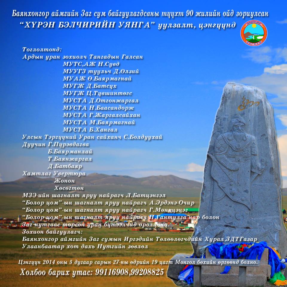 Баянхонгор аймгийн Заг сумын түүхт 90 жилийн ойн баяр 2014 оны 07 дугаар сарын 18-20-ны өдрүүдэд тохионо. Уг баярыг тохиолдуулан Улаанбаатар хот дахь нутгийн зөвлөл, Заг сумын иргэдийн төлөөлөгчдийн хурал, ЗДТГ-ын санаачилгаар түүхт 90 жилийнхээ ойд зориулсан “Хүрэн бэлчирийн уянга” уулзалт цэнгүүнийг зохион байгуулахаар болжээ.