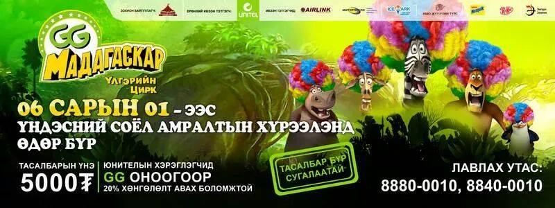 “GG Мадагаскар”  үлгэрийн цирк 6 дугаар сарын 1- нээс Үндэсний соёл амралтын хүрээлэнд өдөр бүр тоглох гэж байна  Амьтны хүрээлэнгийн хэсэг амьтад Африкийн ширэнгэн ойд хэрхэн ирж, ямар адал явдалтай учирч, анд нөхдийн нандин холбоо, эр зоригоороо яаж даван туулж байгаа онц сонирхолтой аялалын түүхийг хүүхдүүд та бүхэн хүрэлцэн ирж үзээрэй.