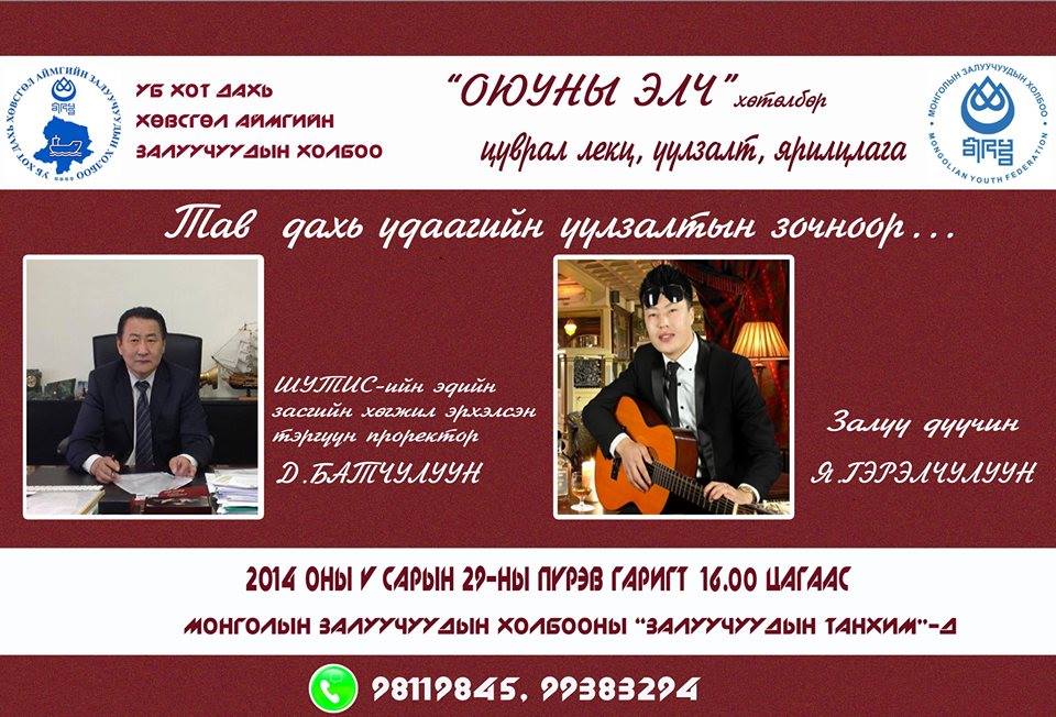 МЗХ-ны дэргэдэх Улаанбаатар хот дахь Хөвсгөл аймгийн Залуучуудын холбоо 2014 оны ажлын төлөвлөгөөндөө залуучуудын хөгжлийг дэмжих, оролцоог нэмэгдүүлэх хамтдаа хөгжих зорилгоор “Оюуны элч” хөтөлбөрийг хэрэгжүүлж эхэлсэн юм. Хөтөлбөр хоёр үе шаттай хэрэгжиж байгаа бөгөөд Улаанбаатар хот дахь нь энэ удаагийн уулзалт болоод 10 сар хүртэл завсарлах юм. 6-р сараас 9-р сар хүртэл “Оюуны элч” орон нутагт давалгаалж сум бүрт залуучуудын уулзалт, лекц, “Нэг ном-Нэг иргэн” зэрэг аяныг өрнүүлэхээр бэлтгэл ажилдаа оржээ. Оюуны элч”-ийн 5 дахь удаагийн зочноор ШУТИС-ийн Эдийн засгийн хөгжил эрхэлсэн тэргүүн проректор Д.Батчулуун, “Хоймон сайхан нутаг”, “Монголоо санасан сэтгэл” зэрэг олон дуугаараа олны танил болоод байгаа залуу дуучин Я.Гэрэлчулуун нар оролцохоор болжээ. Хөвсгөл аймгийн оюутан, залуучууд энэ 5-р сарын 29-нд МЗХолбооны “Залуучуудын танхим”-д уулзахаар цаг товложээ.