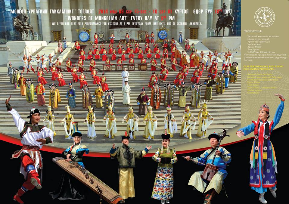 Үндэсний Дуу Бүжгийн Эрдмийн чуулга нь 2014 оны "Монгол урлагийн гайхамшиг" тоглолтоо 6 сарын 15 -ны 18:00 цагт тоглолтоо эхлүүлнэ. Бүтэн зуны турш өдөр бүр тасралтгүй тоглох юм.
