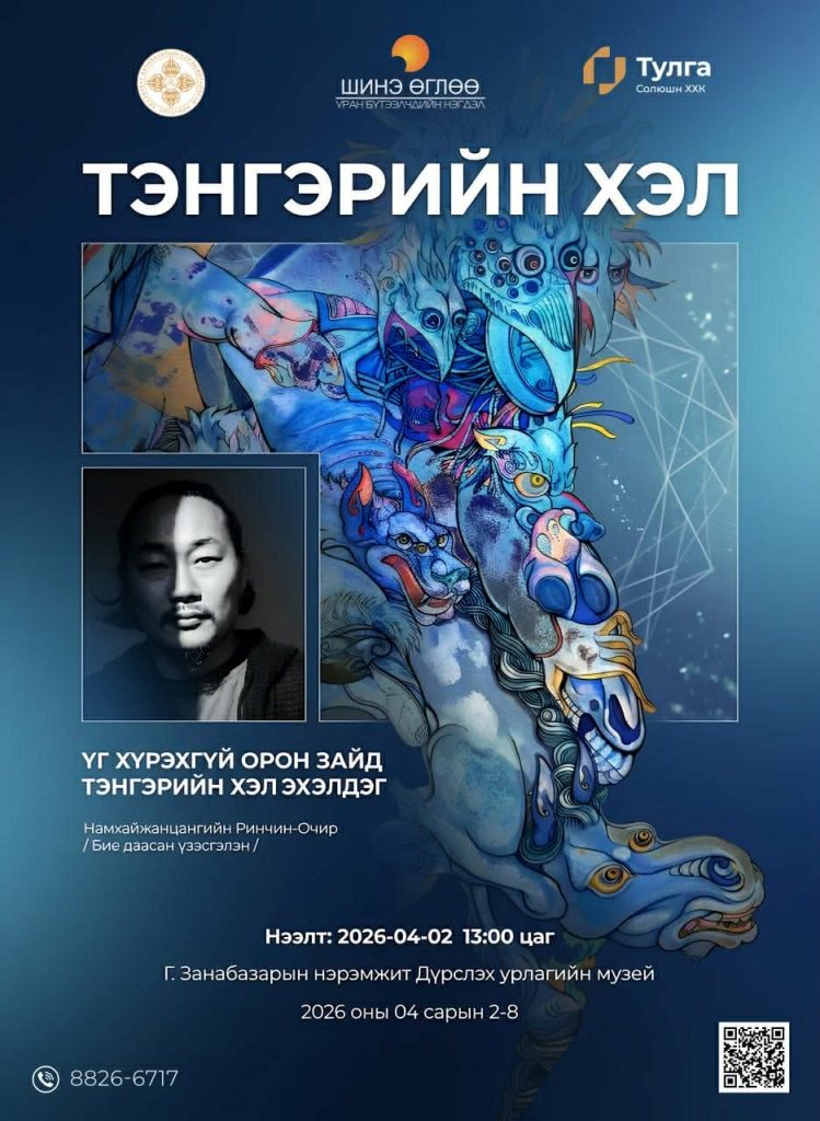 МУЭ-ийн гишүүн, “Монгол зураг” нийгэмлэгийн гишүүн, “Шинэ өглөө” нэгдлийн тэргүүн Н.Ринчин-Очир “Тэнгэрийн хэл” бие даасан үзэсгэлэнгээ Г.Занабазарын нэрэмжит Дүрслэх урлагийн музейд дөрөвдүгээр сарын 2-нд нээнэ.