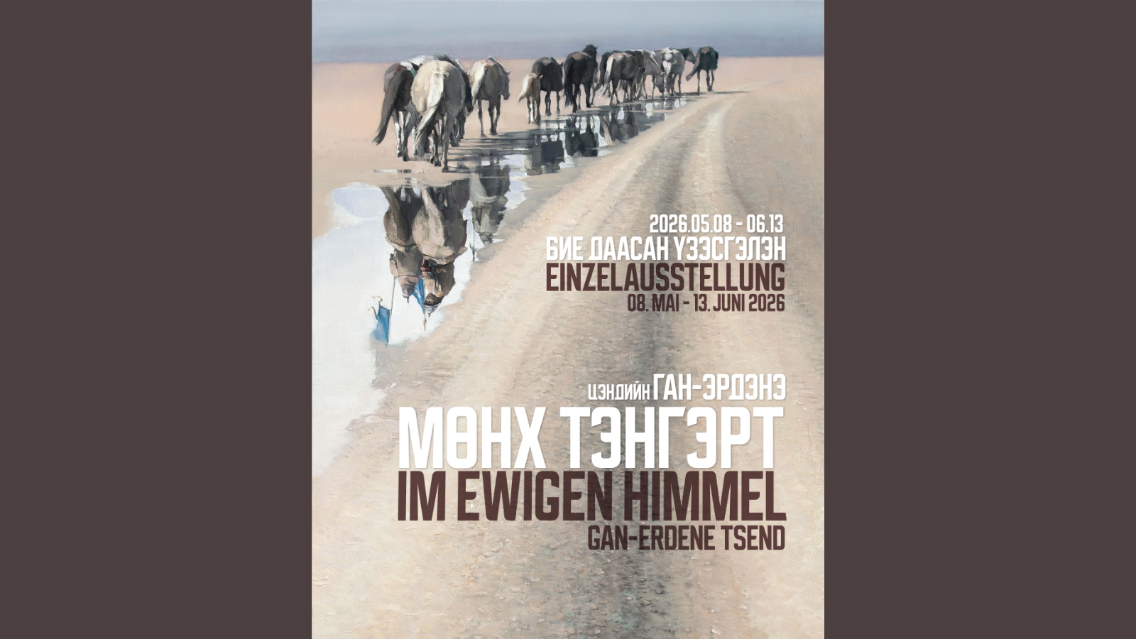 Монгол-Германы боловсролын салбарын хамтын ажиллагааны 100 жилийн ойг тохиолдуулан Монгол Улсын Соёлын элч, уран бүтээлч Цэндийн Ган-Эрдэнэ “Мөнх тэнгэрт” бие даасан үзэсгэлэнгээ 2026 оны тавдугаар сарын 8-наас зургаадугаар сарын 13-ны хооронд “Чингис хаан” Үндэсний музейд толилуулна.