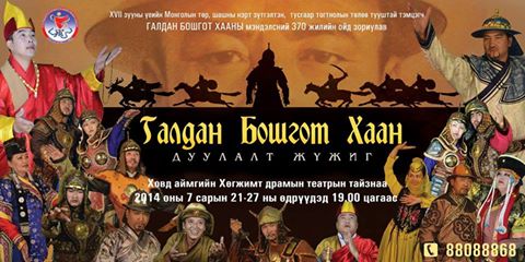Ховд аймгийн Хөгжимт драмын театрын уран бүтээлчид “Галдан бошгот хаан” дуулалт жүжгийг тайзнаа тавьжээ. Уг дуулалт жүжгийг “Галдан бошгот хаан” мэндэлсний 370 жилийн ойд зориулж үзэгчдийн хүртээл болгосон байна. Найруулагчаар Ардын жүжигчин Б.Мөнхдорж ажилласан бөгөөд 17 хүний бүрэлдэхүүнтэй зөвлөх баг ажиллажээ. Дуулалт жүжиг энэ сарын 21-27-ны өдрүүдэд Ховд аймгийн хөгжимт драмын театрын тайзнаа тоглогдох юм.