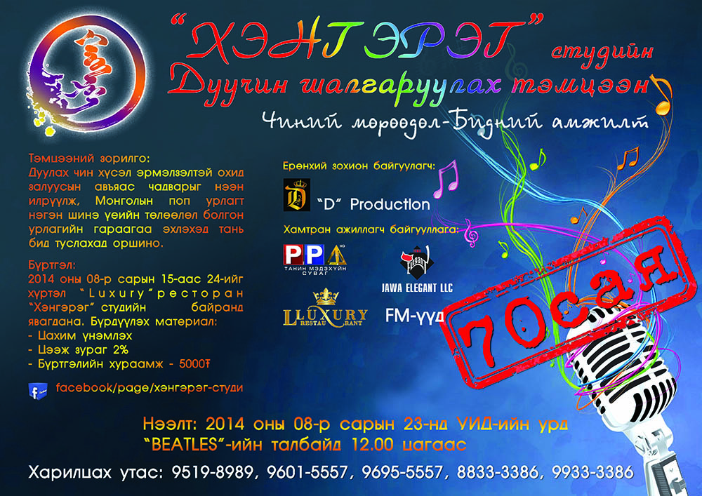Монголын Топ 10 дуу бичлэгийн студийн нэг болох "ХЭНГЭРЭГ" дуу бичлэгийн студийн Артист шалгаруулах нээлттэй тэмцээний уралдаан зарлагдлаа. Өөртөө итгэлтэй, хүсэл мөрөөдөлдөө хөтлөгдсөн охид залуусыг 70.000.000 – ийн продюсерын гэрээтэй уралдаанд урьж байна.