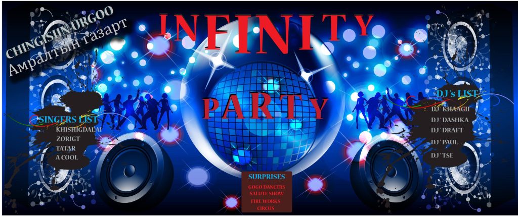 Их хотын соёлтой дэгжин, эрхэмсэг залууст зориулсан их хотын намрын анхны задгай парти тун удахгүй болох гэж байна. Цоглог, эрч хүчтэй залуус та бүхнийг ирэх 9-р сарын 2-ний 19:00 цагт Чингисийн өргөө цогцолборт зохион байгуулагдах гэж буй их хотын намрын анхны задгай партид хүрэлцэн ирж гайхалтай infinity , electro хөгжимийн хэмнэлд хамтдаа нэгдэн, нэгэн үдшийг мартагдахааргүй өнгөрүүлэхийг урьж байна.