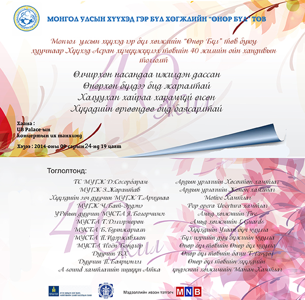Сонирхуулахад 40 жилийн ойн баярын хурал, концерт нь 10 дугаар сарын 10-ны 12 цагт Нийслэлийн Соёлын төв өргөөнд болно.