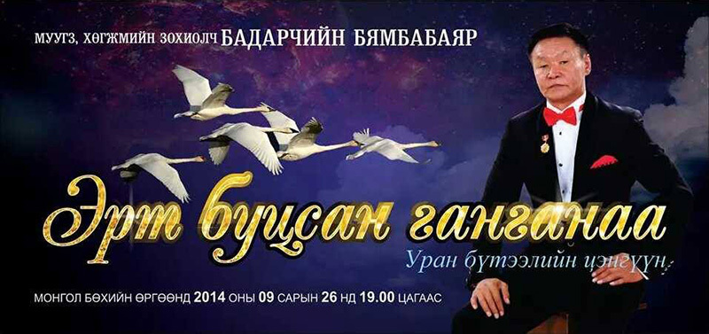 Дуугаараан би тантай хамт байж чадсан хэмээн уянгалуулах УГЗ хөгжмийн зохиолч Бадарчийн Бямбабаярын “Эрт буцсан ганганаа” уран бүтээлийн тоглолт 2014-09-26 нд 19 цагаас “Монгол бөхийн өргөө”-нд ганцхан удаа болох юм байна. Хэзээний зангаргатай дуучдын хоолойн чансааг шалгадаг мэргэжлийн , урт настай дуу бүтээдгээрээ УГЗ Б.Бямбабаяр алдартай. Төрийн хошой шагналт хөгжмийн зохиолч Н.Жанцанноров “дууны урлагт шинэчлэл хийсэн хүн” гэж ухаарч байгаагаа хэлсэн бол Ардын уран зохиолч Б.Лхагвасүрэн “Хөгжмийн зохиолч Бямбабаяр бол Монгол түмэнд зориулж бурхнаас томилогдсон гайхалтай хөгжмийн зохиолчидын нэг гарцаагүй мөн…” хэмээжээ.