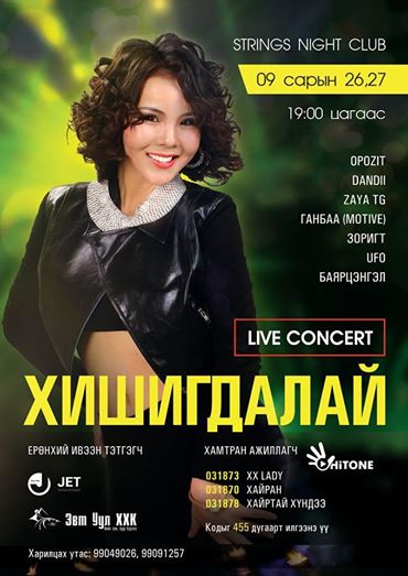 Дуучин А.Хишигдалай өөрийн сонсогч фенүүддээ зориулж анхны бие даасан тоглолтоо Есдүгээр сарын 26, 27-нд буюу өнөөдөр маргааш 2 өдрийн турш "Strings night club"- д тоглох гэж байна.