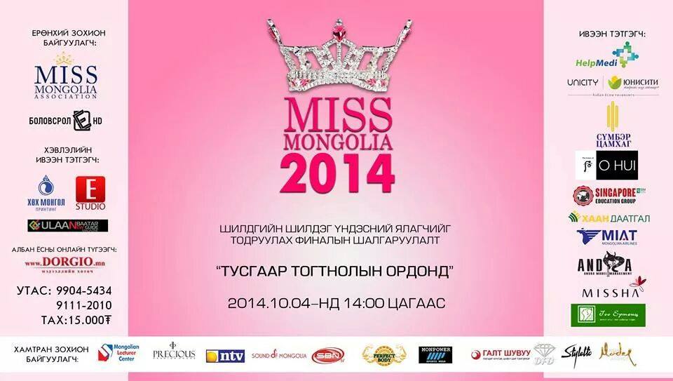 “Miss Mongolia 2014” тэмцээнд хот, хөдөөгийн 70 гаруй оролцогчоос тунаж үлдсэн бүсгүйчүүд маань гоо үзэсгэлэн, энх тайвны элч болж эх орныхоо болон дэлхийн хүмүүнлэгийн үйл хэрэгт хувь нэмрээ оруулж сайхан сэтгэл, мэдлэг боловсролоороо өрсөлдөн оны шилдэг болхын төлөө, олон улсын миссийн тэмцээний жишгээр Мисс Фото, Мисс Спорт, Мисс Авъяас, Мисс Модеь, Мисс Бикини, Мисс Гүүдвил (оюунлаг, ухаалаг, тусч) гэсэн төрлөөр тус тус өрсөлдсөн бөгөөд одоо "Miss Mongolia 2014" наадмын сүүлчийн шалгаруулалт болох үндэсний ялагчийг тодруулах финалын шоу маань Тусгаар тогтнолын ордонд өнөөдөр буюу 10 сарын 4-ний 14:00 цагаас зохион байгуулагдах ба та бүхнийг хүрэлцэн ирж үзэхийг урьж байна!!!