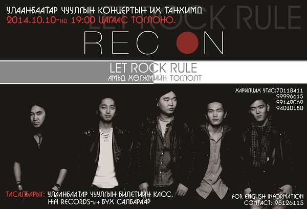 Улаанбаатар чуулгын концертын их танхимд 2014 оны 10 сарын 10-нд 19:00 цагаас амьд хөгжмийн "LET ROCK RULE" тоглолт болох гэж байна. Энэхүү тоглолт нь Coke’n beat /2013/ наадмын ялагч "REC ON" /Г.Дөлгөөн, Б.Бэлгүүн, Б.Цэнд, Ц.Баасандорж, Ж.Нямхүү/ хамтлагийн анхны бие даасан тоглолт юм.