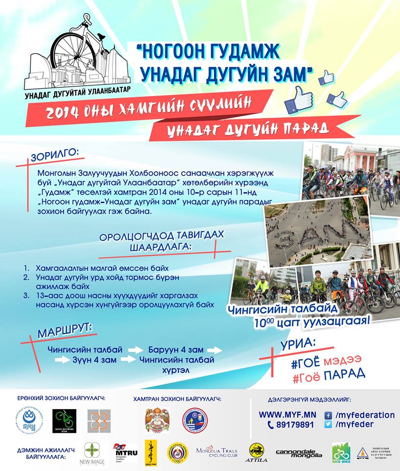 Тэгвэл энэ Бямба гараг буюу 10-р сарын 11-нд энэ намрын хаалт “Ногоон гудамж-Унадаг дугуйн зам” унадаг дугуйн парад “гоё мэдээ, гоё парад” гэсэн уриатайгаар зохион байгуулагдах гэж байна. Парад дээр Эдийн Засгийн Хөгжлийн Яам “Гудамж” төслийн санаачлан хэрэгжүүлэхээр төвөвлөж байгаа “Ногоон гудамж-Унадаг дугуйн зам” төслийг таницуулах юм байна.