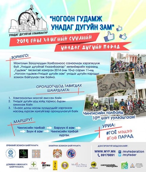2014 оны 10 сарын 11-нд буюу Бямба гарагт зохион байгуулагдах байсан “Ногоон гудамж-Унадаг дугуйн зам” унадаг дугуйн парад Цаг агаарын шалтгаанаар түр хойшлогдлоо. Дэлгэрэнгүй мэдээллийг 89179891, 88083780 утсаар болон https://www.facebook.com/events/628812923901466/, www.myf.mn хаягаар аваарай.