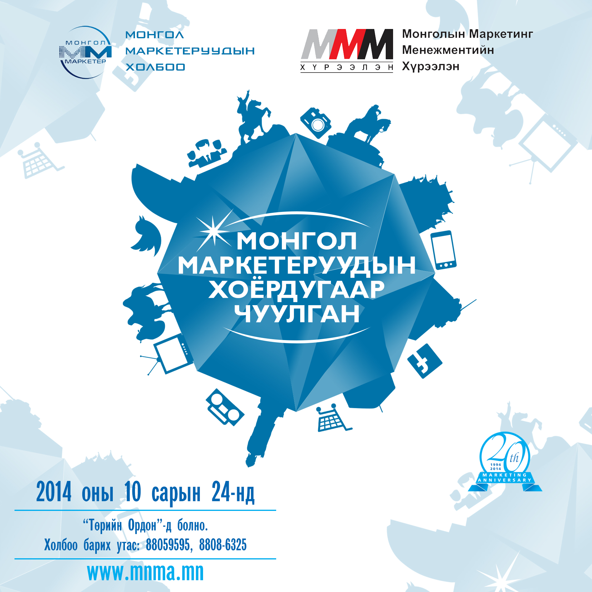 Маркетинг бол бизнесийг хөдөлгөгч гол амин зүрх гэвэл хэн ч маргахгүй бизээ. Тэгвэл Монгол Улсын хөдөлгөгч зүрх болсон шилдэг маркетерууд энэ сарын 24-нд Ерөнхийлөгчийн дэмжлэг дор төрийн ордонд чуулах гэж байна. Энэхүү чуулганы зорилго нь дэлхийдМонгол улсаа сурталчлах нэгдсэн бодлого тодорхойлох, дэлхийн брэндийг Монголдоо бүтээх гэх мэт хэд хэдэн томоохон асуудал хэлэлцэх юм байна.