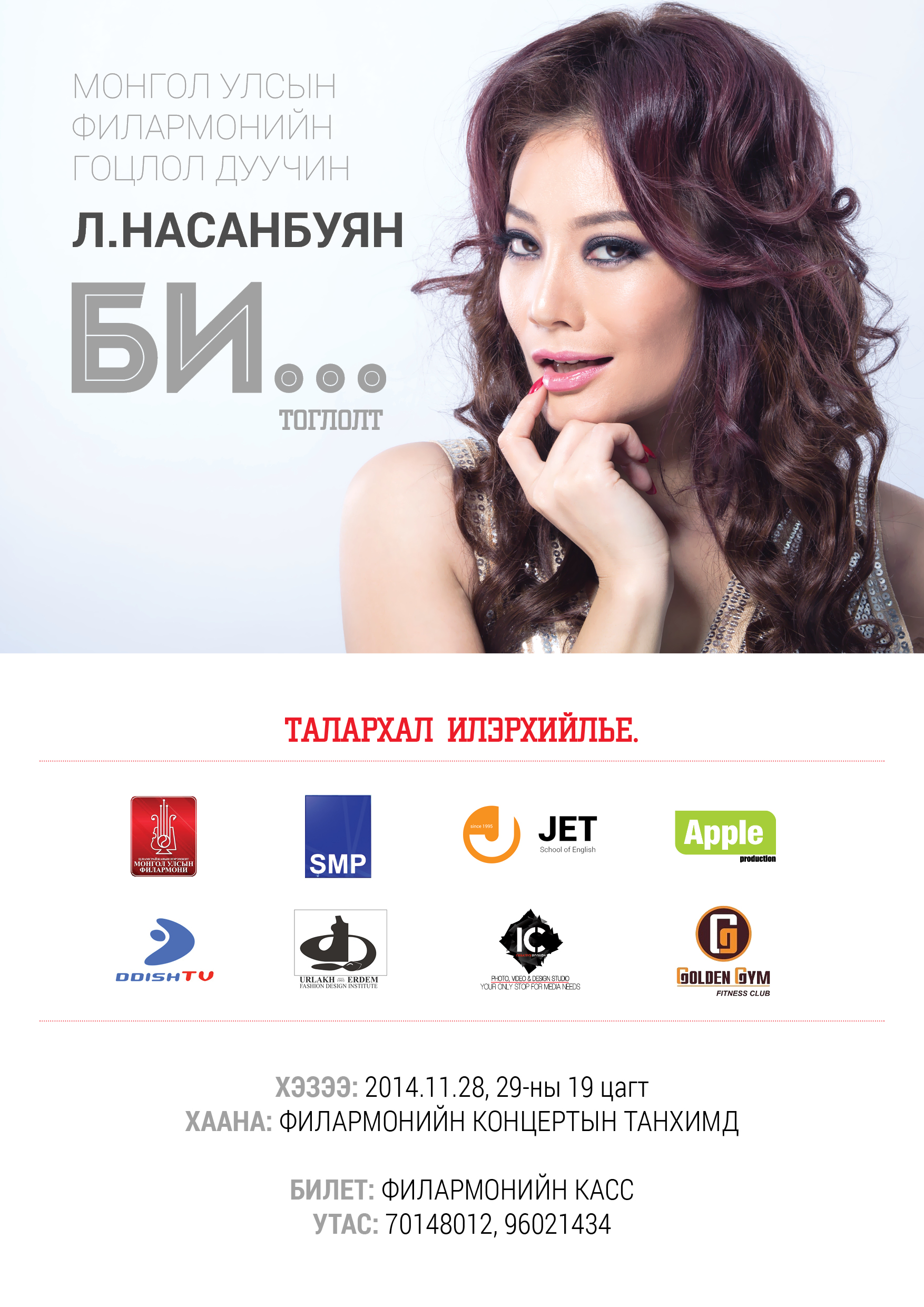 Монгол Улсын филармоний гоцлол дуучин Л.Насанбуян 2014 онд уран бүтээлийн шинэ ертөнцөө нээх гэж байна. Зууны манлай дуучин поп хатагтай Б.Сарантуяагийн шавь гэдгээрээ бахархаж явдаг дуучин Насаа “БИ…” нэртэй анхны бие даасан тоглолтоо Монгол Улсын филармоний тайзнаа 11 сарын 28 , 29 нд хийхээр товоо зарлажээ.