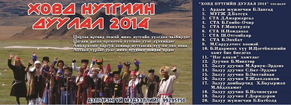 Улаанбаатар хот дахь Ховд аймгийн залуучуудын холбооны санаачилгаар “ХОВД НУТГИЙН ДУУЛАЛ” 2014 тоглолтыг энэ сарын 29-нд Монгол бөхийн өргөөнд зохион байгуулахаар болжээ. Ховд нутгийнхаа сум бүрийн төлөөлөл болсон шилдэг уран бүтээлчид оролцож ая дууны цэнхэр хадаг өргөж, Ховд нутгийн зон олон хамтдаа нэгэн үдшийг өнгөрөөх боломжийг бий болгохын зэрэгцээ сумдынхаа залуучуудын үйл ажиллагааг дэмжих зорилготой ажээ.