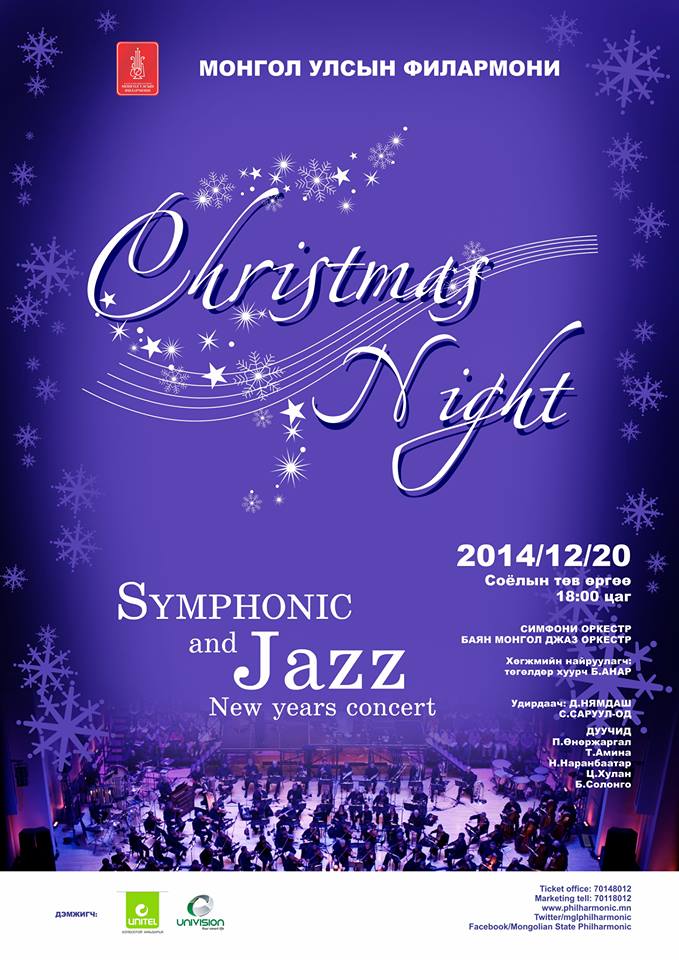 Хүн төрөлхтний түүхэн дэх хамгийн эртний баяр болох шинэ жилийн баярыг улс орон даяараа угтах гэж буй энэ цаг мөчид монгол улсын Филармони шинэ жилийн хөгжмийн “Christmas night” тоглолтоо 12-р сарын 20-нд 18.00 цагт Соёлын төв өргөөнд үзэгчдийн хүртээл болгох гэж байна.
